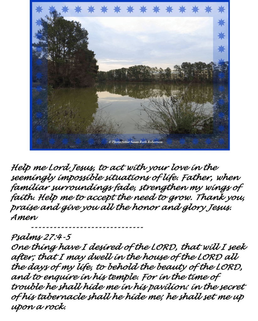 Help me Lord Jesus, to act with your love in the seemingly impossible situations of life. Father, when familiar surroundings fade, strengthen my wings of faith. Help me to accept the need to grow. Thank you, praise and give you all the honor and glory Jesus. Amen