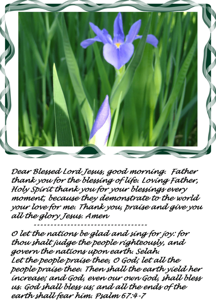 תן לאנשים לשבח אותך, הו אלוהים; בוא כל האנשים משבחים אותך. לאחר מכן תהיה האדמה להניב גידולה; ואלוהים, אפילו אלוהים שלנו, יברך אותנו. אלוהים יברך אותנו; וכל קצות הארץ יהיו מפחדים ממנו. תהילים 67: 4-7הקודש במקרא [Hebrew Holy Bible]