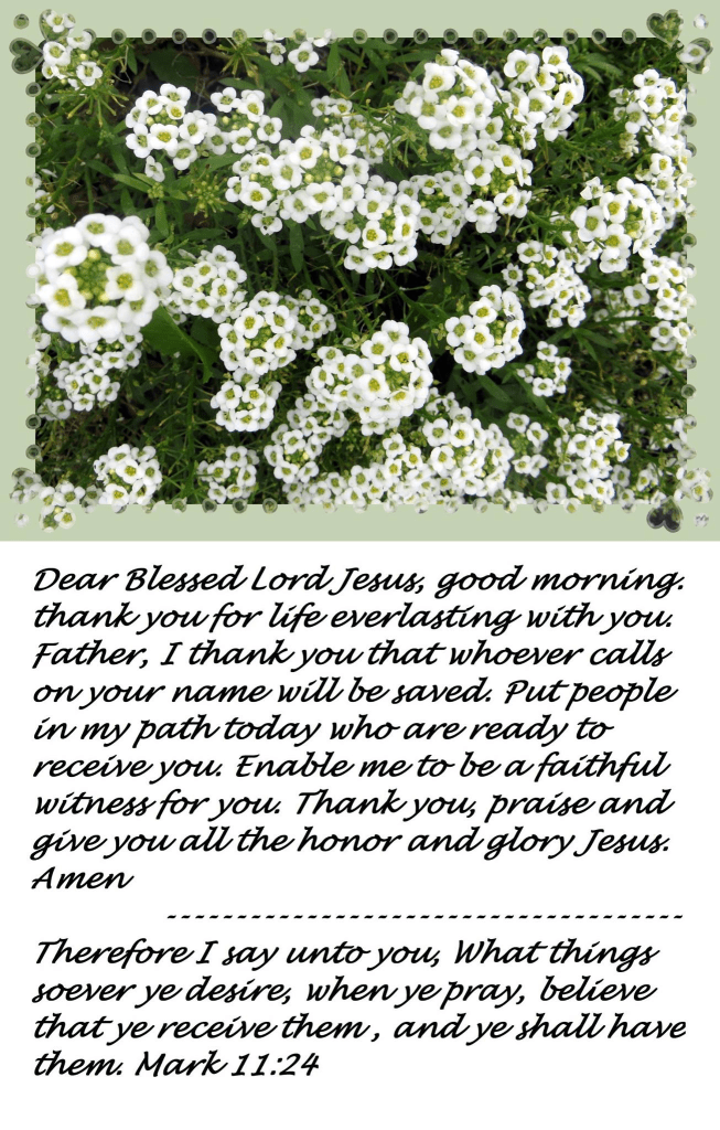 Dear Blessed Lord Jesus, good morning. thank you for life everlasting with you. Father, I thank you that whoever calls on your name will be saved. Put people in my path today who are ready to receive you. Enable me to be a faithful witness for you. Thank you, praise and give you all the honor and glory Jesus. Amen