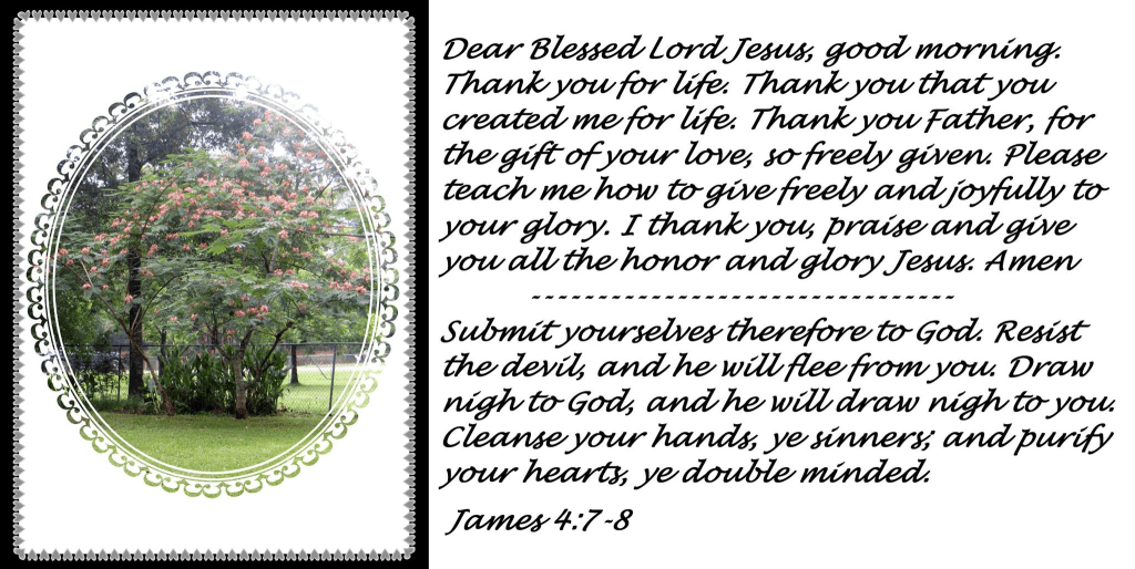 Dear Blessed Lord Jesus, good morning. Thank you for life. Thank you that you created me for life. Thank you Father, for the gift of your love, so freely given. Please teach me how to give freely and joyfully to your glory. I thank you, praise and give you all the honor and glory Jesus. Amen