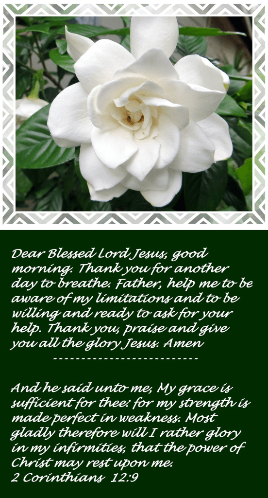 Dear Blessed Lord Jesus, good morning. Thank you for another day to breathe. Father, help me to be aware of my limitations and to be willing and ready to ask for your help. Thank you, praise and give you all the glory Jesus. Amen