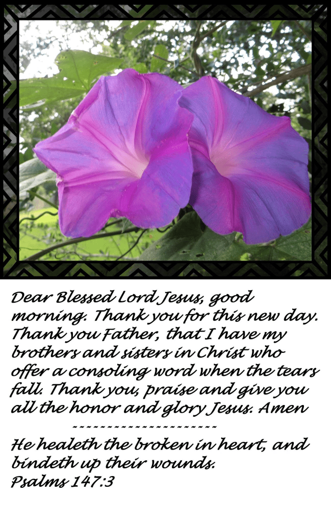 Dear Blessed Lord Jesus, good morning. Thank you for this new day. Thank you Father, that I have my brothers and sisters in Christ who offer a consoling word when the tears fall. Thank you, praise and give you all the honor and glory Jesus. Amen