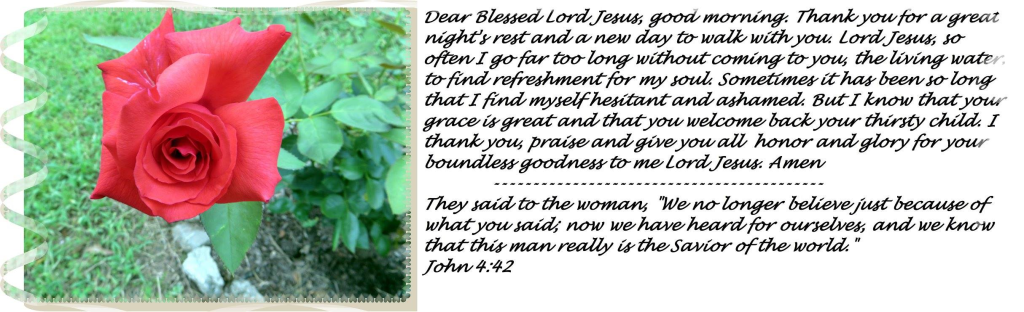 Dear Blessed Lord Jesus, good afternoon. Thank you for a great nights sleep and wonderful day. Thank you for interference, it changes things for the better. Thank you for this new day to walk with you. Lord Jesus, so often I go far too long without coming to you, the living water, to find refreshment for my soul. Sometimes it has been so long that I find myself hesitant and ashamed. But I know that your grace is great and that you welcome back your thirsty child. I thank you, praise and give you all the honor and glory Jesus. Amen