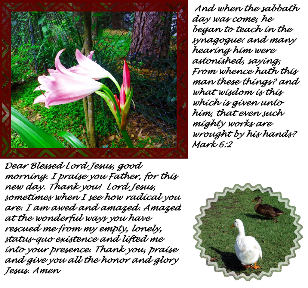 Dear Blessed Lord Jesus, good morning. I praise you Father, for this new day. Thank you! Lord Jesus, sometimes when I see how radical you are. I am awed and amazed. Amazed at the wonderful ways you have rescued me from my empty, lonely, status-quo existence and lifted me into your presence. Thank you, praise and give you all the honor and glory Jesus. Amen