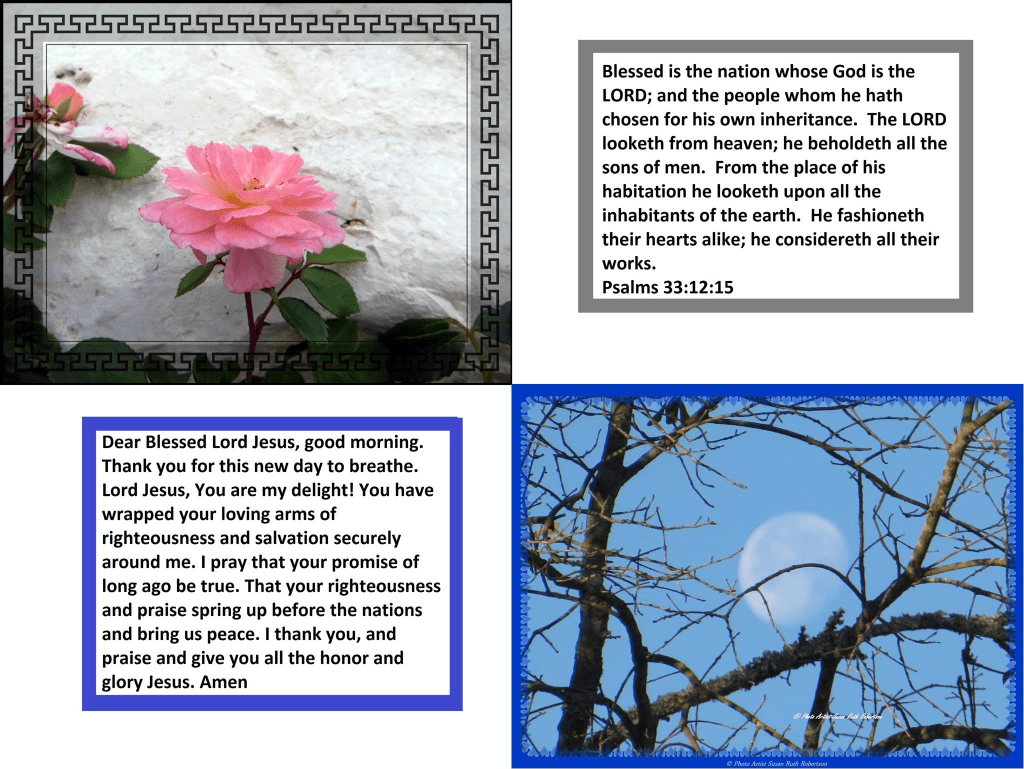 Dear Blessed Lord Jesus, good morning. Thank you for this new day to breathe. Lord Jesus, You are my delight! You have wrapped your loving arms of righteousness and salvation securely around me. I pray that your promise of long ago be true. That your righteousness and praise spring up before the nations and bring us peace. I thank you, and praise and give you all the honor and glory Jesus. Amen.