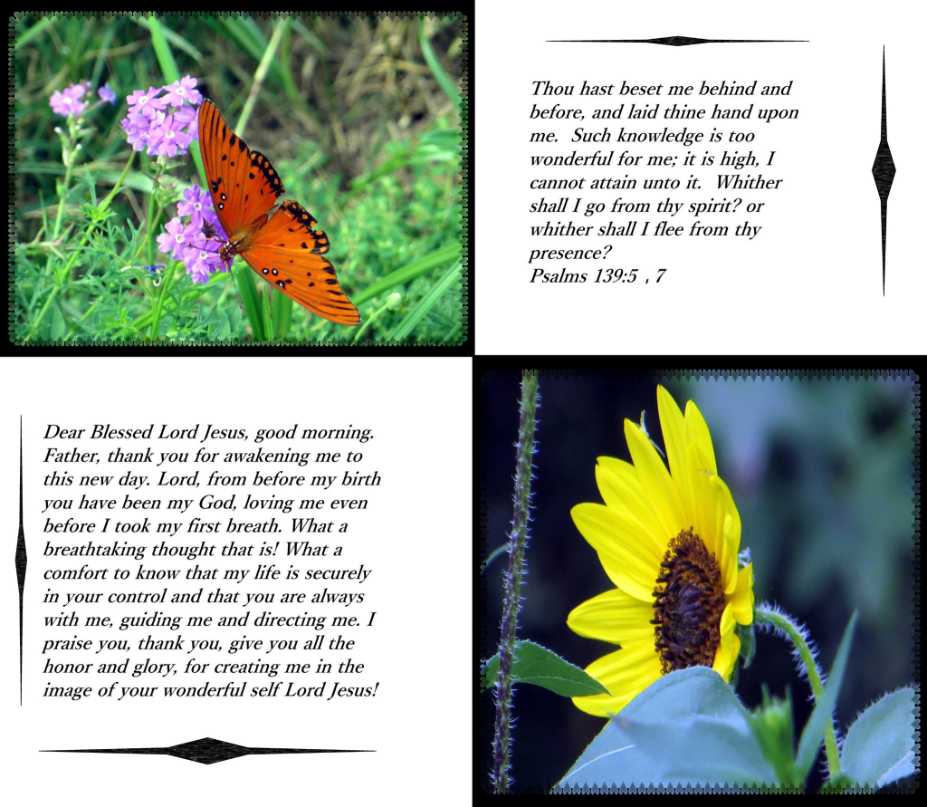 Dear Blessed Lord Jesus, good morning. Father, thank you for awakening me to this new day. Lord, from before my birth you have been my God, loving me even before I took my first breath. What a breathtaking thought that is! What a comfort to know that my life is securely in your control and that you are always with me, guiding me and directing me. I praise you, thank you, give you all the honor and glory, for creating me in the image of your wonderful self-Lord Jesus! Amen.