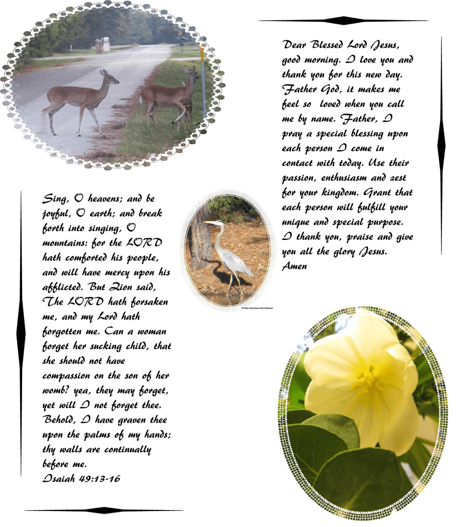 Dear Blessed Lord Jesus, good morning. I love you and thank you for this new day. Father God, it makes me feel so loved when you call me by name. Father, I pray a special blessing upon each person I come in contact with today. Use their passion, enthusiasm and zest for your kingdom. Grant that each person will fulfill your unique and special purpose. I thank you, praise and give you all the glory Jesus. Amen.