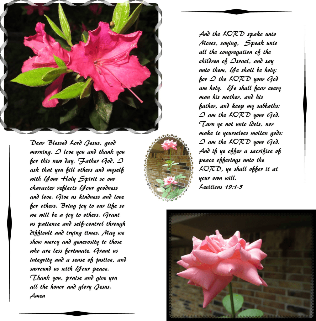 Dear Blessed Lord Jesus, good morning. I love you and thank you for this new day. Father God, I ask that you fill others and myself with Your Holy Spirit, so our character reflects Your goodness and love. Give us kindness and love for others. Bring joy to our life so we will be a joy to others. Grant us patience and self-control through difficult and trying times. May we show mercy and generosity to those who are less fortunate. Grant us integrity and a sense of justice, and surround us with Your peace. Thank you, praise and give you all the honor and glory Jesus. Amen.