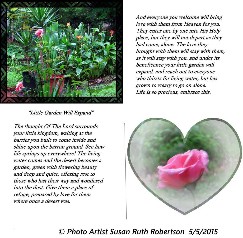 The thought Of The Lord surrounds your little kingdom, waiting at the barrier you built to come inside and shine upon the barron ground. See how life springs up everywhere! The living water comes and the desert becomes a garden, green with flowering beauty and deep and quiet, offering rest to those who lost their way and wondered into the dust. Give them a place of refuge, prepared by love for them where once a desert was.