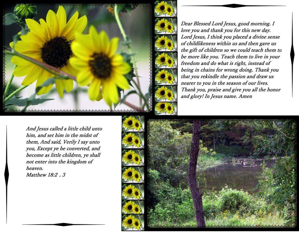 Dear Blessed Lord Jesus, good morning. I love you and thank you for this new day. Lord Jesus, I think you placed a divine sense of childlikeness within us and then gave us the gift of children so we could teach them to be more like you. Teach them to live in your freedom and do what is right, instead of being in chains for wrong doing. Thank you that you rekindle the passion and draw us nearer to you in the season of our lives. Thank you, praise and give you all the honor and glory! In Jesus name. Amen.
