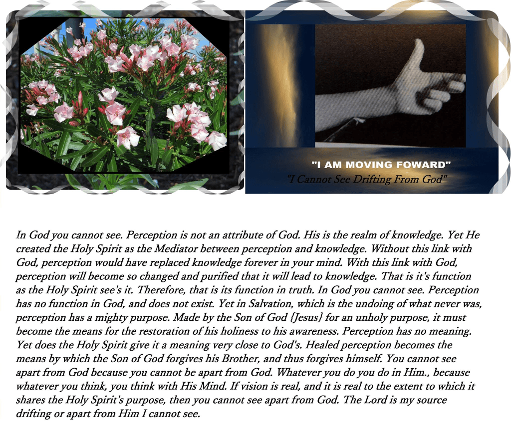 In God you cannot see. Perception is not an attribute of God. His is the realm of knowledge. Yet He created the Holy Spirit as the Mediator between perception and knowledge. Without this link with God, perception would have replaced knowledge forever in your mind. With this link with God, perception will become so changed and purified that it will lead to knowledge. That is it’s function as the Holy Spirit see’s it. Therefore, that is its function in truth. In God you cannot see. Perception has no function in God, and does not exist. Yet in Salvation, which is the undoing of what never was, perception has a mighty purpose. Made by the Son of God {Jesus} for an unholy purpose, it must become the means for the restoration of his holiness to his awareness. Perception has no meaning. Yet does the Holy Spirit give it a meaning very close to God’s. Healed perception becomes the means by which the Son of God forgives his Brother, and thus forgives himself. You cannot see apart from God because you cannot be apart from God. Whatever you do you do in Him., because whatever you think, you think with His Mind. If vision is real, and it is real to the extent to which it shares the Holy Spirit’s purpose, then you cannot see apart from God. The Lord is my source drifting or apart from Him I cannot see.