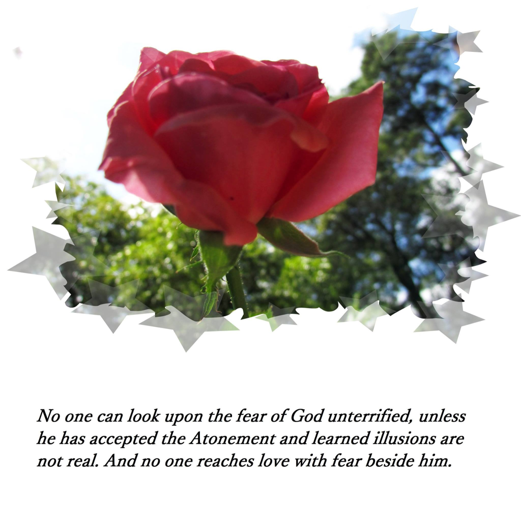 No one can look upon the fear of God unterrified, unless he has accepted the Atonement and learned illusions are not real. And no one reaches love with fear beside him.