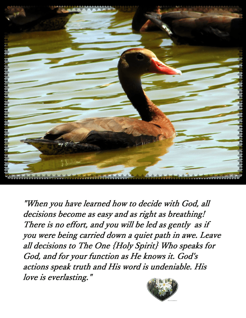 “When you have learned how to decide with God, all decisions become as easy and as right as breathing! There is no effort, and you will be led as gently as if you were being carried down a quiet path in awe. Leave all decisions to The One {Holy Spirit} Who speaks for God, and for your function as He knows it. God’s actions speak truth and His word is undeniable. His love is everlasting.”