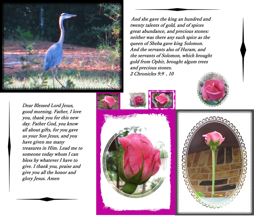 Dear Blessed Lord Jesus, good morning. Father, I love you, thank you for this new day. Father God, you know all about gifts, for you gave us your Son Jesus, and you have given me many treasures in Him. Lead me to someone today whom I can bless by whatever I have to give. I thank you, praise and give you all the honor and glory Jesus. Amen.