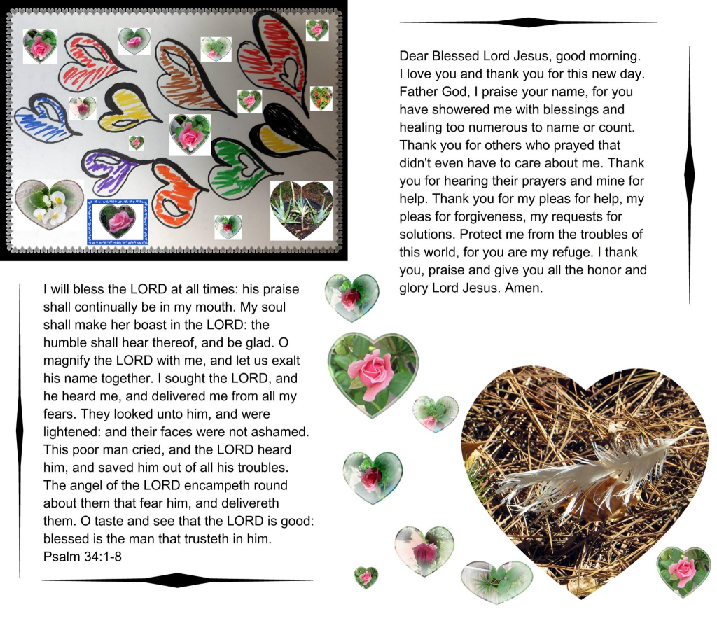 Dear Blessed Lord Jesus, good morning. I love you and thank you for this new day. Father God, I praise your name, for you have showered me with blessings and healing too numerous to name or count. Thank you for others who prayed that didn’t even have to care about me. Thank you for hearing their prayers and mine for help. Thank you for my pleas for help, my pleas for forgiveness, my requests for solutions. Protect me from the troubles of this world, for you are my refuge. I thank you, praise and give you all the honor and glory Lord Jesus. Amen.