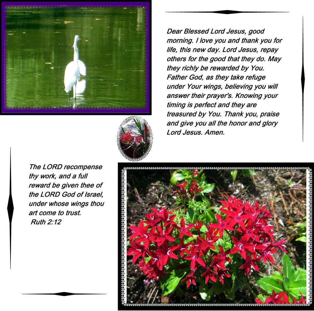 Dear Blessed Lord Jesus, good morning. I love you and thank you for life, this new day. Lord Jesus, repay others for the good that they do. May they richly be rewarded by You. Father God, as they take refuge under Your wings, believing you will answer their prayer’s. Knowing your timing is perfect and they are treasured by You. Thank you, praise and give you all the honor and glory Lord Jesus. Amen.
