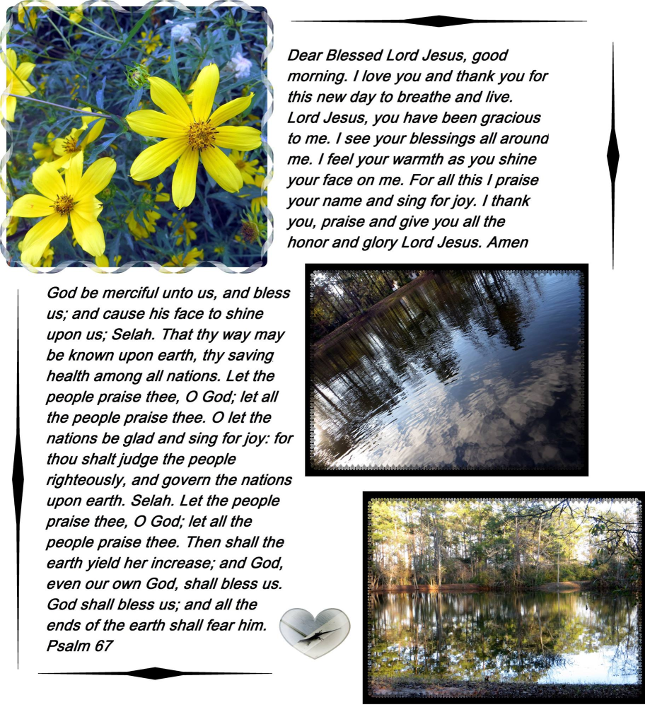 Dear Blessed Lord Jesus, good morning. I love you and thank you for this new day to breathe and live. Lord Jesus, you have been gracious to me. I see your blessings all around me. I feel your warmth as you shine your face on me. For all this I praise your name and sing for joy. I thank you, praise and give you all the honor and glory Lord Jesus. Amen.