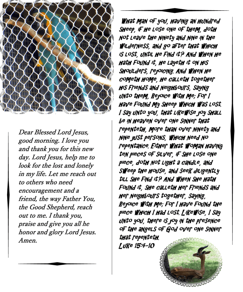 Dear Blessed Lord Jesus, good morning. I love you and thank you for this new day. Lord Jesus, help me to look for the lost and lonely in my life. Let me reach out to others who need encouragement and a friend, the way Father You, the Good Shepherd, reach out to me. I thank you, praise and give you all he honor and glory Lord Jesus. Amen.