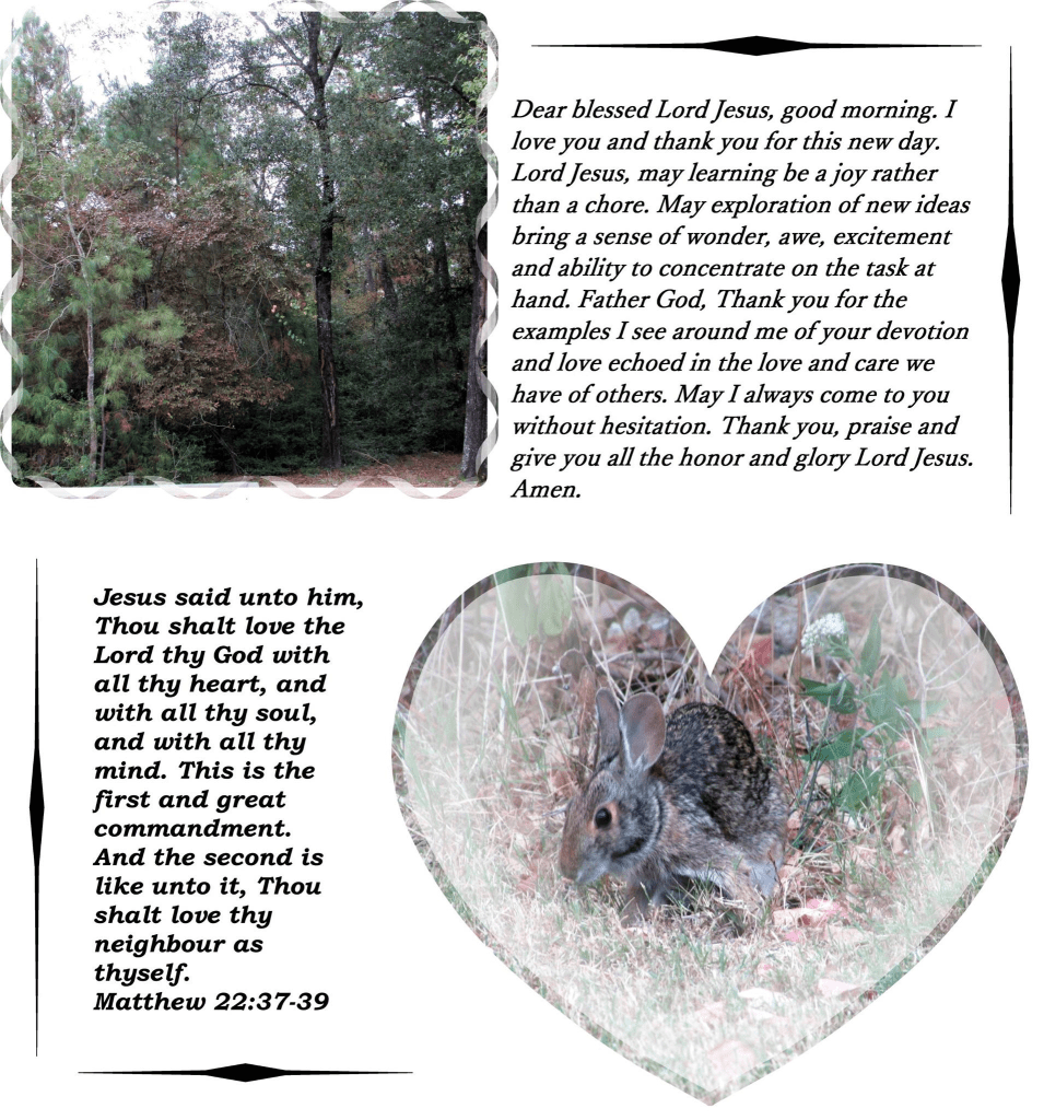 Dear blessed Lord Jesus, good morning. I love you and thank you for this new day. Lord Jesus, may learning be a joy rather than a chore. May exploration of new ideas bring a sense of wonder, awe, excitement and ability to concentrate on the task at hand. Father God, Thank you for the examples I see around me of your devotion and love echoed in the love and care we have of others. May I always come to you without hesitation. Thank you, praise and give you all the honor and glory Lord Jesus. Amen.