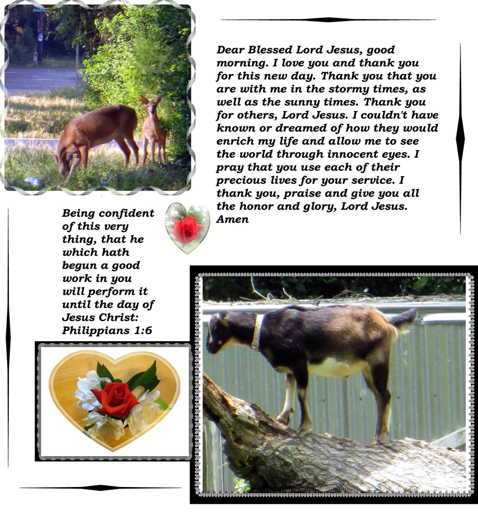 Dear Blessed Lord Jesus, good morning. I love you and thank you for this new day. Thank you that you are with me in the stormy times, as well as the sunny times. Thank you for others, Lord Jesus. I couldn’t have known or dreamed of how they would enrich my life and allow me to see the world through innocent eyes. I pray that you use each of their precious lives for your service. I thank you, praise and give you all the honor and glory, Lord Jesus. Amen.