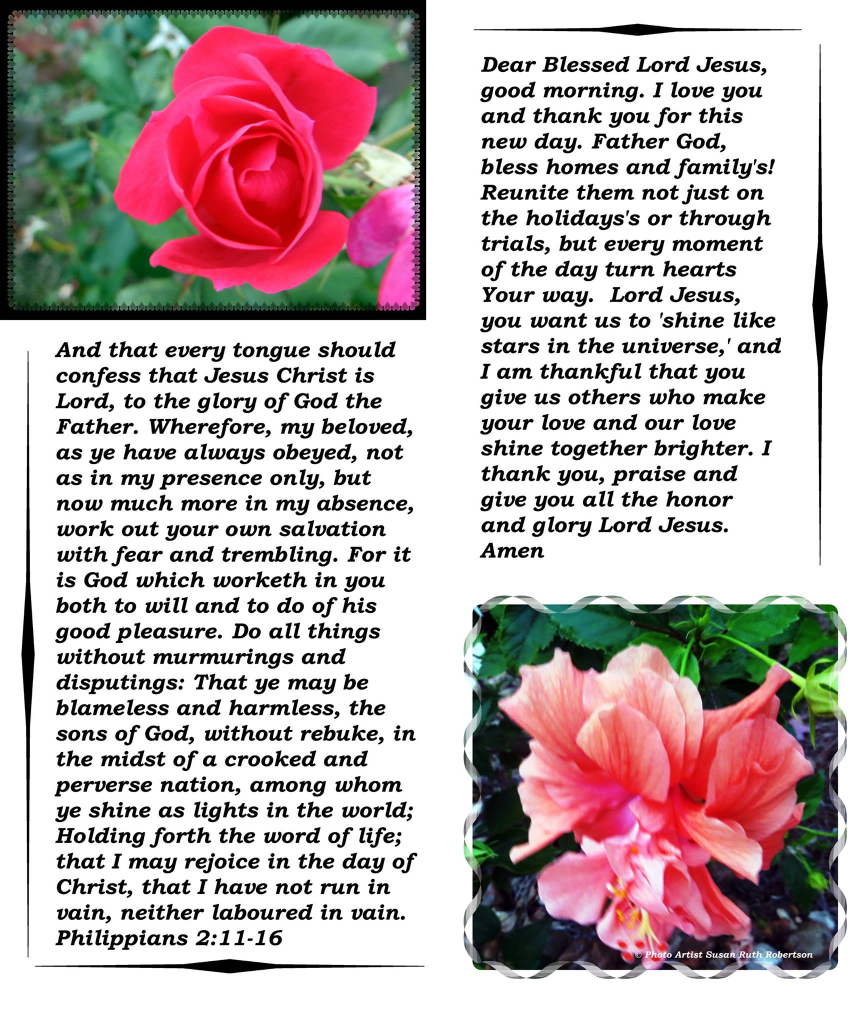 Dear Blessed Lord Jesus, good morning. I love you and thank you for this new day. Father God, bless homes and family’s! Reunite them not just on the holidays’s or through trials, but every moment of the day turn hearts Your way. Lord Jesus, you want us to ‘shine like stars in the universe,’ and I am thankful that you give us others who make your love and our love shine together brighter. I thank you, praise and give you all the honor and glory Lord Jesus. Amen