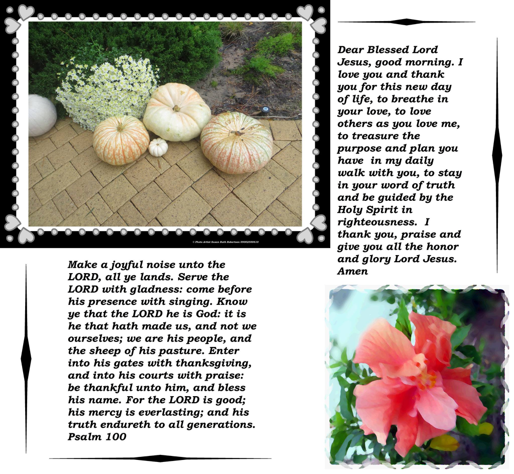 Make a joyful noise unto the LORD, all ye lands. Serve the LORD with gladness: come before his presence with singing. Know ye that the LORD he is God: it is he that hath made us, and not we ourselves; we are his people, and the sheep of his pasture. Enter into his gates with thanksgiving, and into his courts with praise: be thankful unto him, and bless his name. For the LORD is good; his mercy is everlasting; and his truth endureth to all generations.