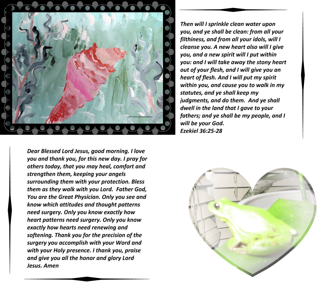 Dear Blessed Lord Jesus, good morning. I love you and thank you, for this new day. I pray for others today, that you may heal, comfort and strengthen them, keeping your angels surrounding them with your protection. Bless them as they walk with you Lord. Father God, You are the Great Physician. Only you see and know which attitudes and thought patterns need surgery. Only you know exactly how heart patterns need surgery. Only you know exactly how hearts need renewing and softening. Thank you for the precision of the surgery you accomplish with your Word and with your Holy presence. I thank you, praise and give you all the honor and glory Lord Jesus. Amen.