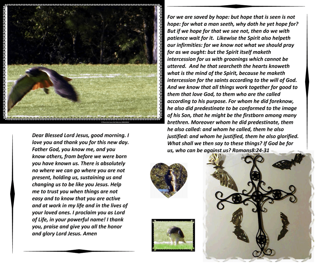 For we are saved by hope: but hope that is seen is not hope: for what a man seeth, why doth he yet hope for? But if we hope for that we see not, then do we with patience wait for it. Likewise the Spirit also helpeth our infirmities: for we know not what we should pray for as we ought: but the Spirit itself maketh intercession for us with groanings which cannot be uttered. And he that searcheth the hearts knoweth what is the mind of the Spirit, because he maketh intercession for the saints according to the will of God. And we know that all things work together for good to them that love God, to them who are the called according to his purpose. For whom he did foreknow, he also did predestinate to be conformed to the image of his Son, that he might be the firstborn among many brethren. Moreover whom he did predestinate, them he also called: and whom he called, them he also justified: and whom he justified, them he also glorified. What shall we then say to these things? If God be for us, who can be against us? Romans8:24-31