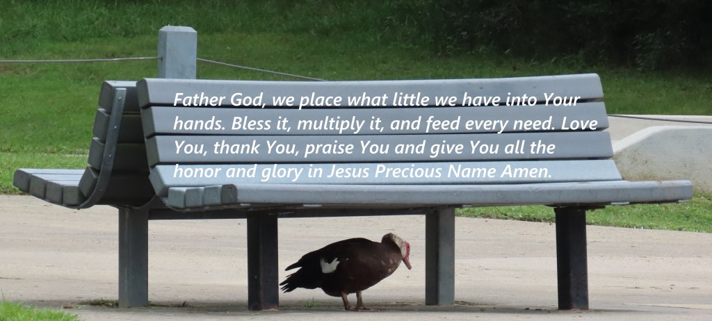 Father God, we place what little we have into Your hands. Bless it, multiply it, and feed every need. Love You, thank You, praise You and give You all the honor and glory in Jesus Precious Name Amen.