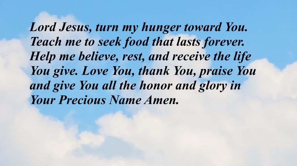 Lord Jesus, turn my hunger toward You. Teach me to seek food that lasts forever. Help me believe, rest, and receive the life You give. Love You, thank You, praise You and give You all the honor and glory in Your Precious Name Amen.