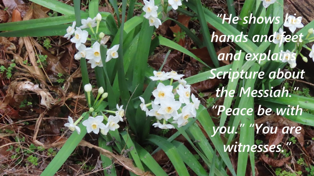“He shows his hands and feet and explains Scripture about the Messiah.” “Peace be with you.” “You are witnesses.”