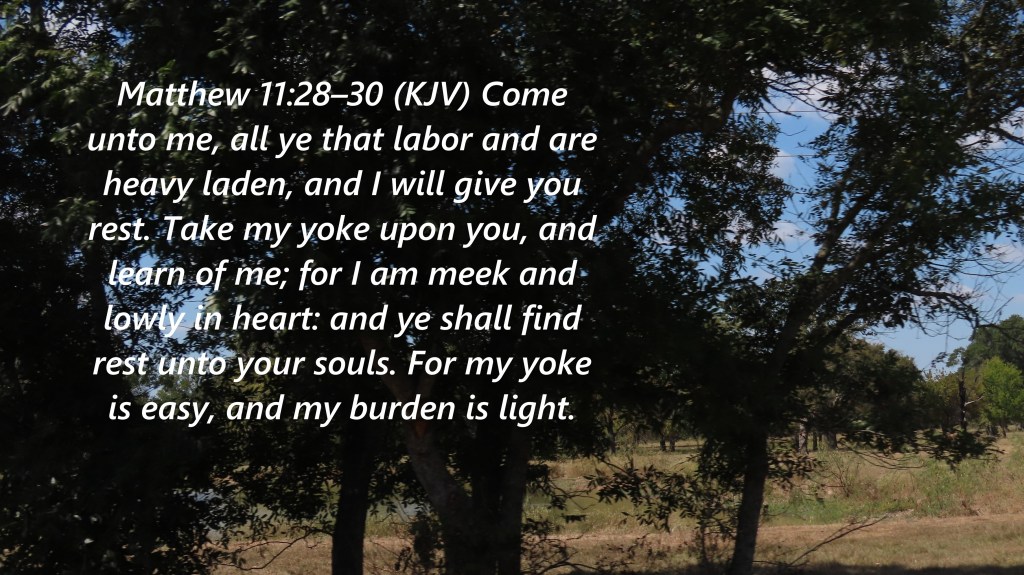 Matthew 11:28–30 (KJV) Come unto me, all ye that labor and are heavy laden, and I will give you rest. Take my yoke upon you, and learn of me; for I am meek and lowly in heart: and ye shall find rest unto your souls. For my yoke is easy, and my burden is light.