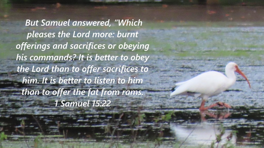 But Samuel answered, “Which pleases the Lord more: burnt offerings and sacrifices or obeying his commands? It is better to obey the Lord than to offer sacrifices to him. It is better to listen to him than to offer the fat from rams. 1 Samuel 15:22 ERV