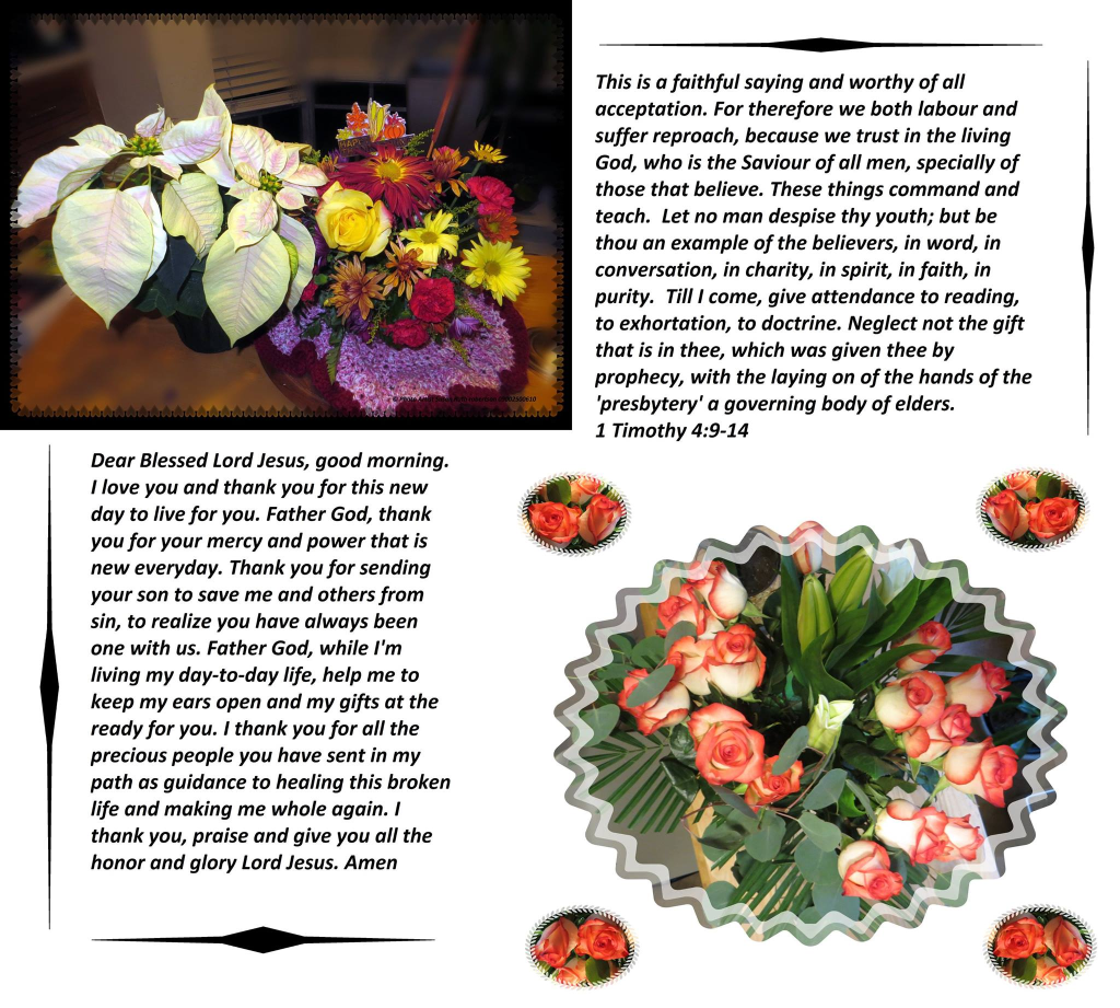 Dear blessed Lord Jesus, good morning. I love you and thank you for this new day to live for you. Father God, thank you for your mercy and power that is new everyday. Thank you for sending your son to save me and others from sin, to realize you have always been one with us. Father God, while I’m living my day-to-day life, help me to keep my ears open and my gifts at the ready for you. I thank you for all the precious people you have sent in my path as guidance to healing this broken life and making me whole again. I thank you, praise and give you all the honor and glory Lord Jesus. Amen.