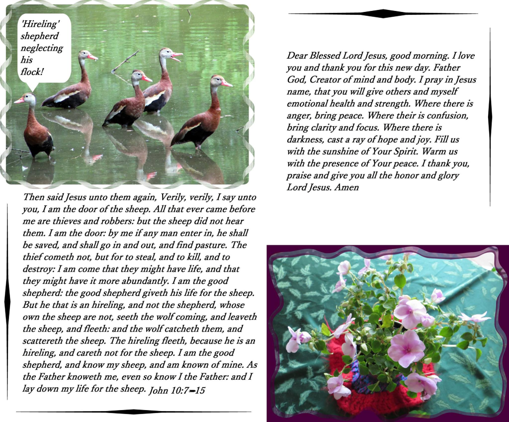 Dear Blessed Lord Jesus, good morning. I love you and thank you for this new day. Father God, Creator of mind and body. I pray in Jesus name, that you will give others and myself emotional health and strength. Where there is anger, bring peace. Where there is confusion, bring clarity and focus. Where there is darkness, cast a ray of hope and joy. Fill us with the sunshine of Your Spirit. Warm us with the presence of Your peace. I thank you, praise and give you all the honor and glory Lord Jesus. Amen. ——————————————————– Then said Jesus unto them again, Verily, verily, I say unto you, I am the door of the sheep. All that ever came before me are thieves and robbers: but the sheep did not hear them. I am the door: by me if any man enter in, he shall be saved, and shall go in and out, and find pasture. The thief cometh not, but for to steal, and to kill, and to destroy: I am come that they might have life, and that they might have it more abundantly. I am the good shepherd: the good shepherd giveth his life for the sheep. But he that is an hireling, and not the shepherd, whose own the sheep are not, seeth the wolf coming, and leaveth the sheep, and fleeth: and the wolf catcheth them, and scattereth the sheep. The hireling fleeth, because he is an hireling, and careth not for the sheep. I am the good shepherd, and know my sheep, and am known of mine. As the Father knoweth me, even so know I the Father: and I lay down my life for the sheep. John 10:7-15