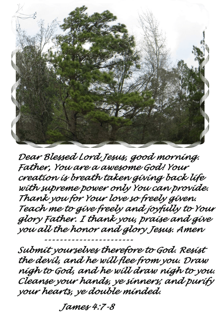 Dear Blessed Lord Jesus, good morning. Father, You are a awesome God! Your creation is breath taken giving back life with supreme power only You can provide. Thank you for Your love so freely given. Teach me to give freely and joyfully to Your glory Father. I thank you, praise and give you all the honor and glory Jesus. Amen.