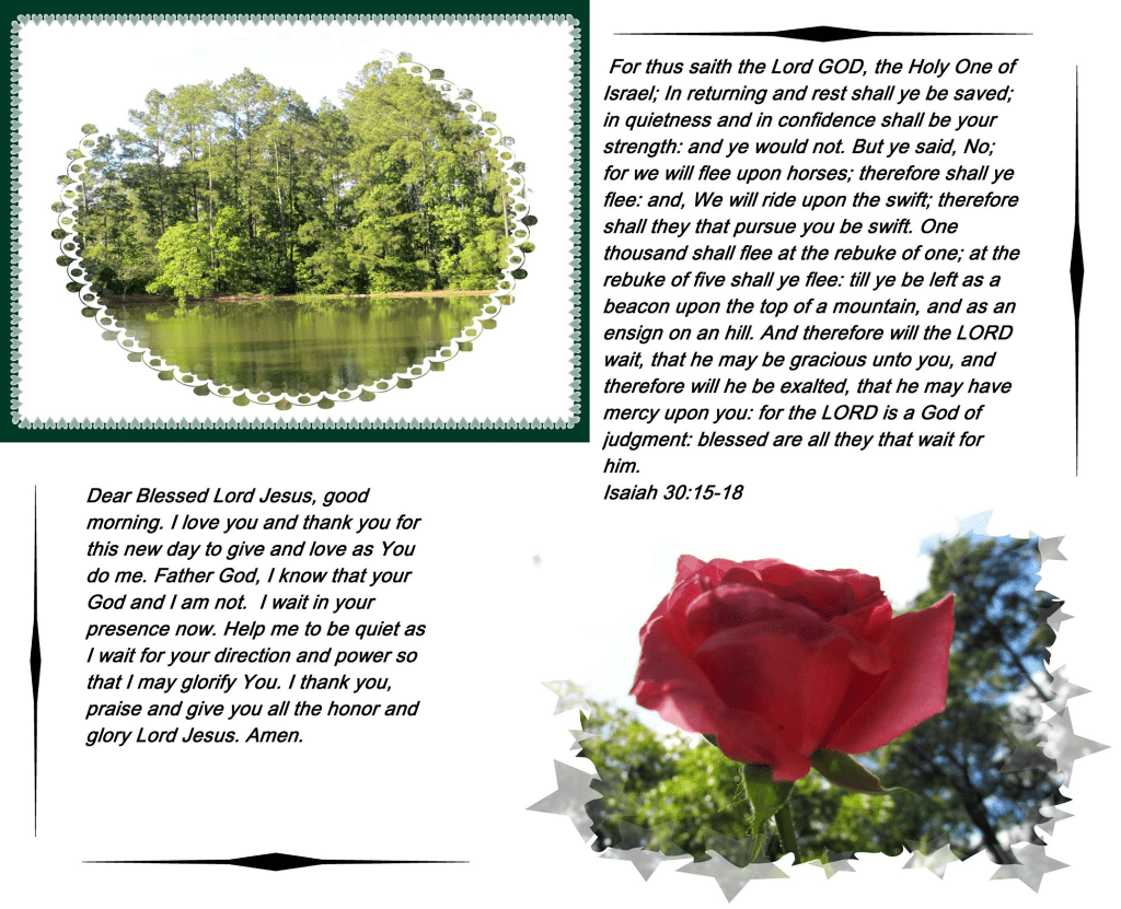 Dear Blessed Lord Jesus, good morning. I love you and thank you for this new day. Precious Lord Jesus Christ, thank you for the privilege of talking to you personally and for the promise that you will hear and answer my prayers. Today I bring you all the concerns and requests of my heart. I trust you to meet every need according to your plan and purpose. I thank you, praise and give you all the honor and glory Lord Jesus. Amen.